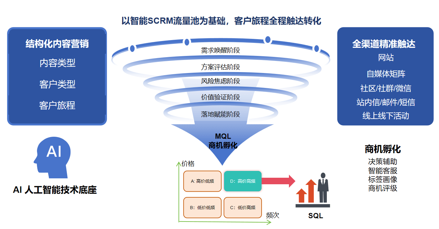 目标客户精准营销: 依据产品特点、应用场景、用户画像精准筛选目标用户群体,针对客户类型、用户旅程设计结构化营销内容,全渠道触达并跟踪获取用户行为数据,结合平台AI分析系统,判断用户成熟度,根据营销漏斗逐层孵化,精准捕获目标客户。通过科学合理流量分层,制定阶段式营销方案,赋能企业品牌推广及精准获客。
