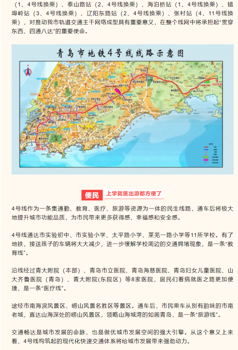 4 号线的 7 座换乘站分别为人民会堂站(3、4 号线换乘)、观象山(市立医院)站(1、4 号线换乘)、泰山路站(2、4 号线换乘)、海泊桥站(1、4 号线换乘)、错埠岭站(3、4 号线换乘)、辽阳东路站(2、4 号线换乘)、张村站(4、11 号线换乘),对推动青岛市轨道交通主干网络成型具有重要意义,在整个线网中将承担起“贯穿东西、四通八达”的重要使命。
