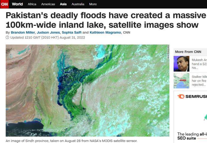 巴基斯坦气候变化部长谢丽·拉赫曼(Sherry Rehman)8月28日表示,“巴基斯坦部分地区‘就像一片小海洋’,最终我们很可能有四分之一或三分之一的土地被淹没在水下。”