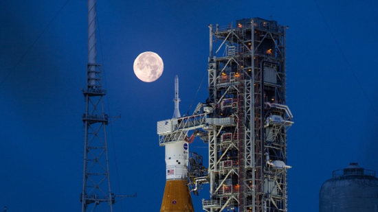太空发射系统(SLS)火箭在美国佛罗里达州肯尼迪航天中心等待发射,这枚强大的火箭是美国宇航局阿尔忒弥斯计划的关键环节。