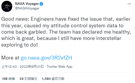 旅行者1号及其“双胞胎”旅行者2号于1977年发射,都在我们的太阳系之外。NASA旅行者号团队以旅行者1号探测器的口吻发推文说:“团队宣布我健康,这很好,因为我还有更多的星际探索要完成!”
