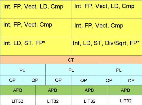 内核架构方面公开的非常少,只知道仅有6个执行端口,但功能灵活,比如可以分配四个为载入、两个为存储,其中四个可以执行对比操作、矢量计算,所有端口都可以做整数操作,大部分可以做浮点操作。