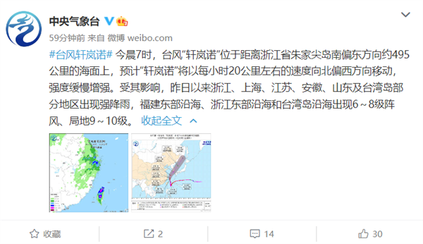 今早7点,“轩岚诺”位于距离浙江省朱家尖岛南偏东方向约495公里的海面上,预计“轩岚诺”将以每小时20公里左右的速度向北偏西方向移动,强度缓慢增强。