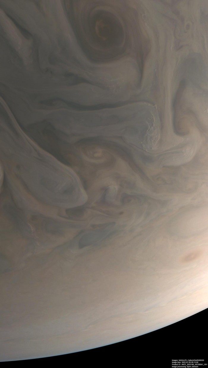 第一张图片(页面顶部)经过处理,描绘了人眼从朱诺号航天器的有利位置看到的大致颜色。第二张图片(上图)也来自于相同的原始数据。然而,在这种情况下,Jónsson对其进行了数字处理,以提高色彩饱和度和对比度,以锐化小规模的特征,并减少原始图像中通常出现的压缩伪影和噪音。这使得图像清晰地揭示了木星大气层中一些最引人入胜的方面,包括因化学成分不同而产生的颜色变化,木星漩涡的三维性质,以及在大气层较高部分形成的小而明亮的"弹出式"云层。