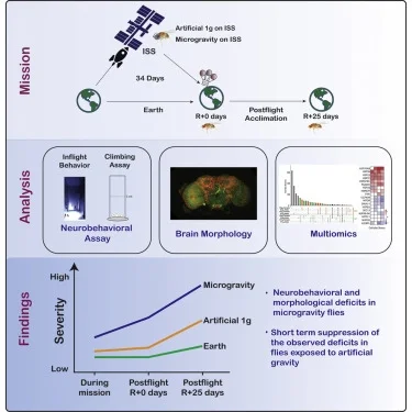 在太空中呆了三周后,这些果蝇被送回地球并被全面研究,包括观察它们的行为,它们大脑中的细胞变化,它们基因表达的变化,以及它们返回后的衰老情况。