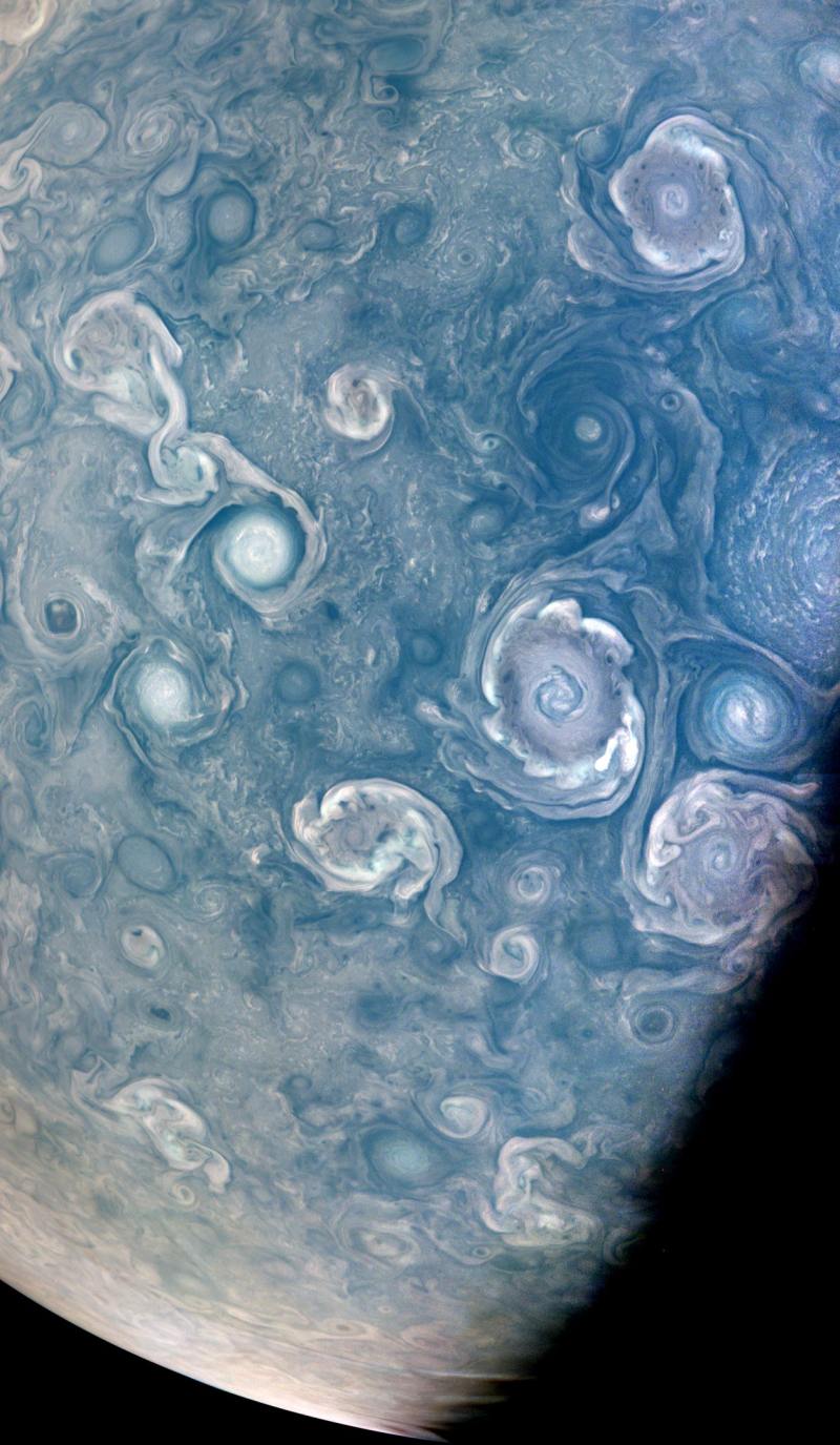 公民科学家Brian Swift利用朱诺相机的原始图像数据创建了这个增强型彩色和对比度的漩涡视图。在拍摄原始图像时,朱诺航天器在木星云顶上方约15,600英里(25,100公里)处,纬度约为84度。