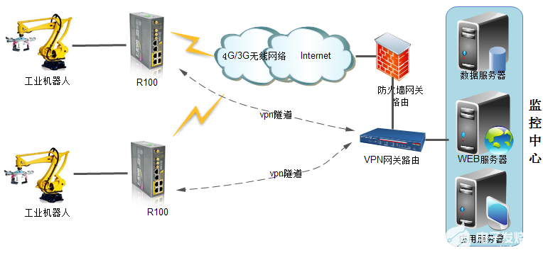 采用监控中心端ADSL/光纤接入Internet获取固定公网的公网ip。搭建vpn服务器、F-R100路由器做vpn建立客户端和服务器vpn隧道两端实现内部网络交换。运行在数据库服务器上的采集系统可以收集路由器下的以太网连接plc工业机器人的数据和控制。从而收集和监控工业机器人的运行状态。