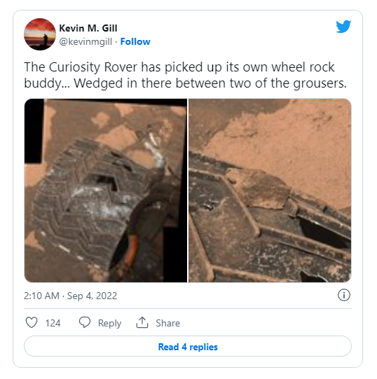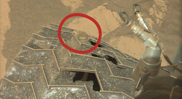 图像处理员Kevin Gill在周末的一篇推文中提到了这块“搭便车”的岩石。Gill写道:“好奇号漫游车捡到了它自己的车轮上的石头伙伴,它夹在两个履带齿片间,”Gill说。履带齿片是车轮上凸起的之字形部分,作为踏板使用。