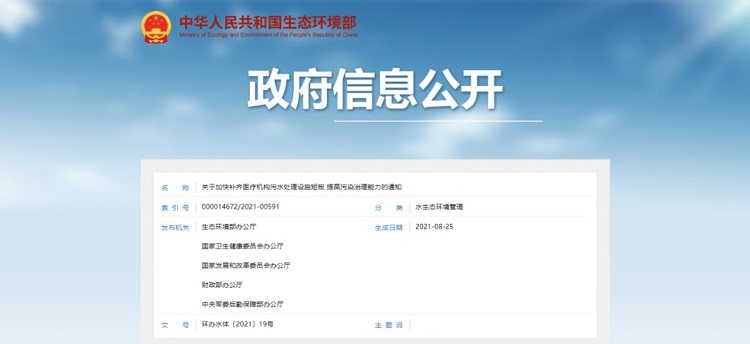 2021年8月的《通知》明确提出要完善医疗机构污水处理设施。传染病医疗机构、20张床位及以上的医疗机构要按规定建设污水处理设施,20张床位以下的医疗机构污水经消毒处理后方可排放。