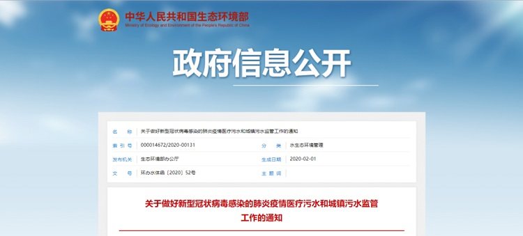 2020年2月1日,生态环境部办公厅印发《关于做好新型冠状病毒感染的肺炎疫情医疗污水和城镇污水监管工作的通知》和《新型冠状病毒污染的医疗污水应急处理技术方案》,总结了SARS以来医疗污水监管的经验,对定点医院、集中隔离场所、饮用水水源地保护等,分别提出了有针对性的管理要求。