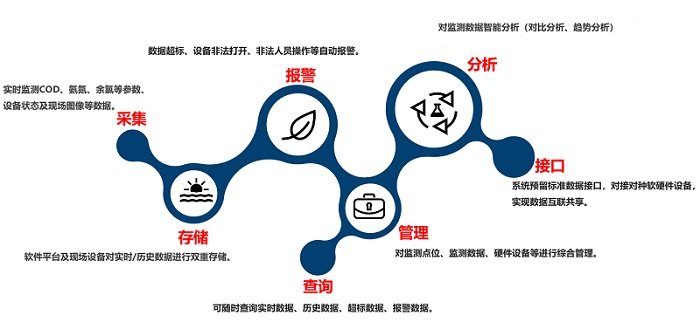 该系统可以对现场的水质数据和报警信息进行采集、处理和显示,同时通过数据传输模块,将采集到的污染物监测数据和报警信息发送到指定的大数据监控平台进行处理和展示,相关管理人员可以根据平台信息及时判断污染物情况。