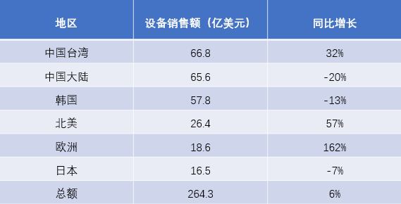 中国台湾地区以66.8亿美元的销售额成为第一,同比、环比增速均达到30%以上,原因在于以台积电为首的大型代工企业一直保持着投资热情;北美的销售额增至26.4亿美元,增长57%;欧洲则增至18.6亿美元,增长源于近期英特尔、三星和台积电都将在这些地区新建工厂,设备的需求量骤增。
