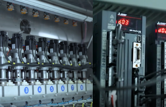 针对这些技术难点,三菱电机与金派克积极沟通、反复调试,最终结合其实际需求,逻辑控制部分采用了三菱电机高性能MELSEC iQ-F系列小型PLC,人机界面采用GOT2000系列,运动控制和伺服驱动部分采用MELSEC iQ-F系列简易运动控制器和MELSEVRO-J4系列交流伺服系统,满足了“高速、稳定、操作简单”等设备制造需求。