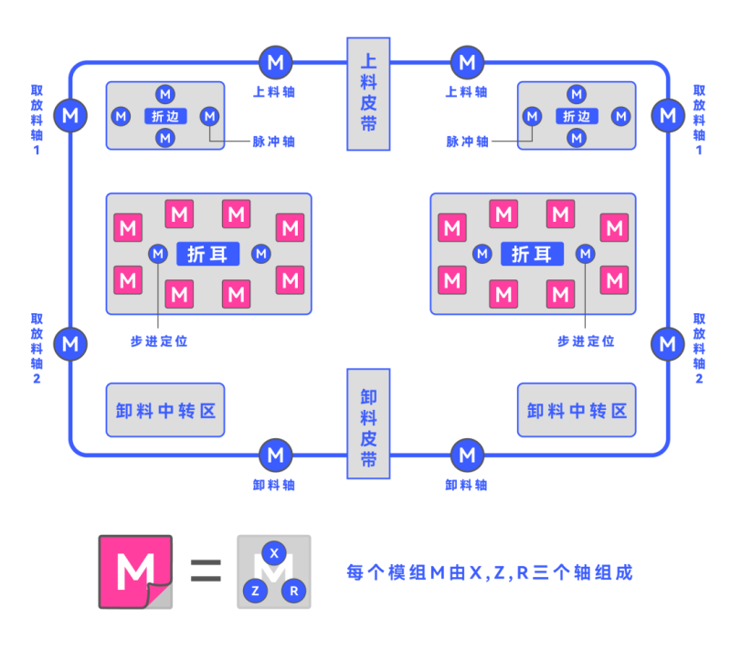 折耳部分由8组模组组成,每组互不干扰,每个模组分别由3个轴组成,分别是左右移动X轴、上下移动Z轴、旋转R轴