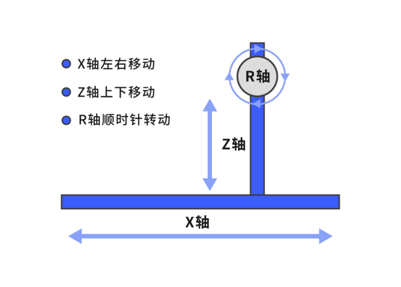 旋转电机上带的夹板顺时针旋转,R轴从0-90度,X,Z轴不动