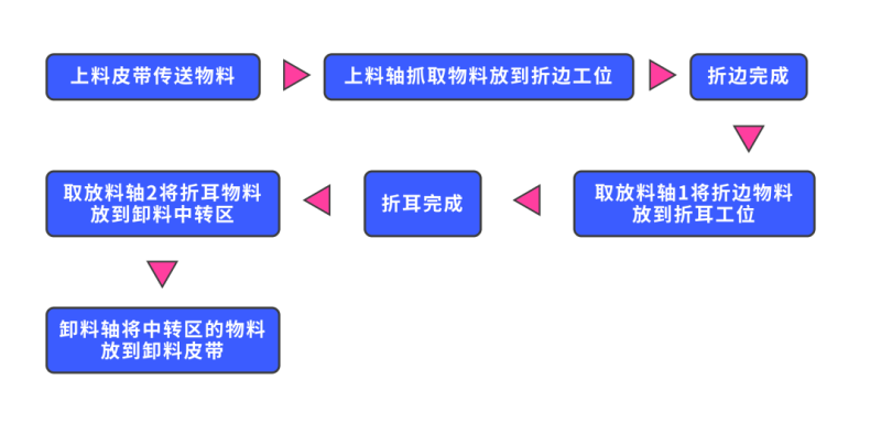 由于旋转轴带的夹爪是存在厚度的,在整个运动过程中其参考的基点以及旋转半径不同,所以根据基点的变化和旋转半径通过算法自行计算,通过输入所需折耳的窄边及长边尺寸自动计算出R轴0-360度,对应X轴,Z轴的运行轨迹。