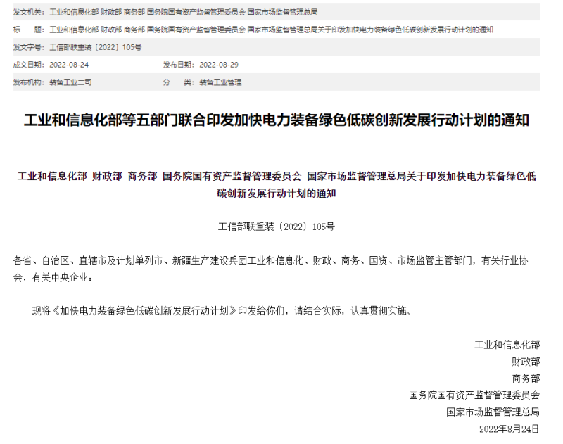 8月29日,工信部等五部门发文,联合印发加快电力装备绿色低碳创新发展行动计划的通知。