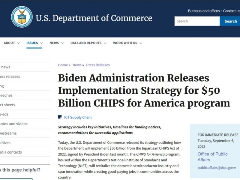 当天,美商务部在官网披露了“芯片法案”中500亿美元资金分配的战略文件。根据文件,这笔资金将主要用于建立、扩大前沿半导体的国内生产,并形成充足、稳定的成熟制程芯片供应,确保下一代半导体技术在美国的研发和生产。该文件估计,这笔资金将能创造数万份高薪制造工作及超过十万份建造工作,并确保工作机会惠及妇女、有色人种等。