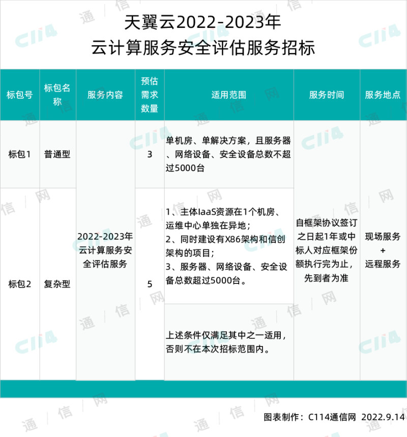 C114讯 9月13日消息(焦焦)从中国电信官网获悉,天翼云2022-2023年云计算服务安全评估服务招标项目已具备招标条件,现进行公开招标,特邀请有意向的且具有提供标的物能力的潜在投标人参加投标。