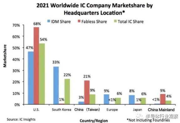 再从下图来看,中国大陆在芯片设计(fabless)这一块,只占了全球9%。也就是说国内2810家企业,仅拿下了全球9%的份额,但在企业数量上远超全球总和。