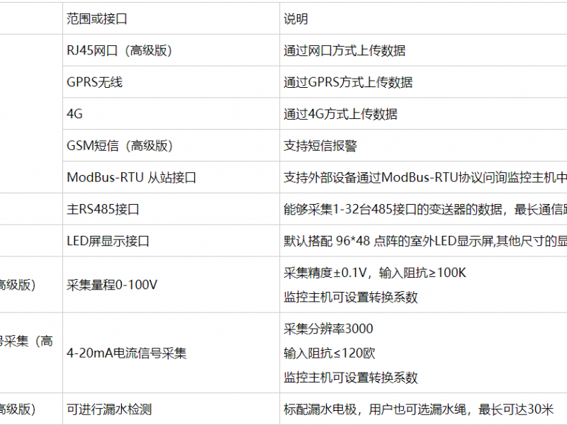 RY-QXZZ精装版气象站具有1路ModBus-RTU主站接口(可通过此接口连接我司485变送器:其中默认为1路风速,1路风向,1路土壤温度+水分+EC,1路空气温湿度,1路噪声,1路二氧化碳,1路大气压力,1路光照,1路雨雪状态,1路紫外线,1路总辐射,1路一氧化碳,1路臭氧,1路二氧化氮,1路氧气,1路空气质量,1路负氧离子,1路蒸发量;同时精装版气象站可以根据客户自己的需求任意搭配485变送器,不限于默认的485设备)、1路雨量采集(总雨量+瞬时雨量+日雨量+当前雨量),2路继电器输出;该设备可通过GPRS方式将数据上传值监控软件平台,也可以通过网口接入局域网,同时该气象站还带有1路ModBus-RTU从站接口也可将数据通过485通信的方式上传至客户的监控软件或PLC组态屏等;该气象站还能外接1路LED屏显示