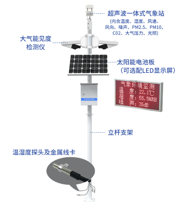 ⑤、“一站式气象监测系统”用于对风速、风向、雨量、空气温度、露点温度、空气湿度、人体杆状温度、日雨量、累计雨量、当前雨量、光照强度、土壤温度、土壤湿度、蒸发量、大气压力,总辐射,日照时数等十几个气象要素进行全天候现场监测。
