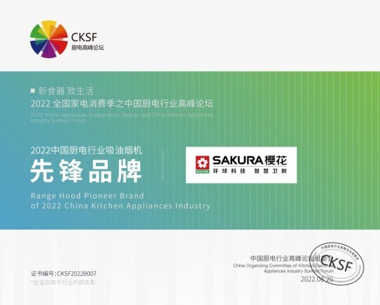 作为精耕厨电领域45年的SAKURA樱花,通过精准的市场定位与产品创新,收获了来自市场与消费者的认可。2022年8月26日,由中国家用电器协会指导,中国家电网主办的“新食器 致生活——2022中国厨电行业高峰论坛”在哈尔滨举行,会上,SAKURA樱花一举斩获“2022中国厨电行业吸油烟机先锋品牌”、“2022中国厨电行业优选套系”、“2022中国厨电行业渠道贡献”三项大奖。