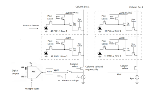 现有多种不同的像素晶体管设计,包括三晶体管 (3T)、四晶体管 (4T) 和五晶体管 (5T) 版本。在 4T 布局中,光电二极管将接收到的可见光子转换为电荷。每个电压一次读取一行并放入柱状电容器 (C) 中。然后使用解码器和多路复用器进行读取。