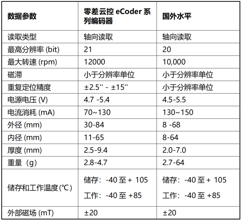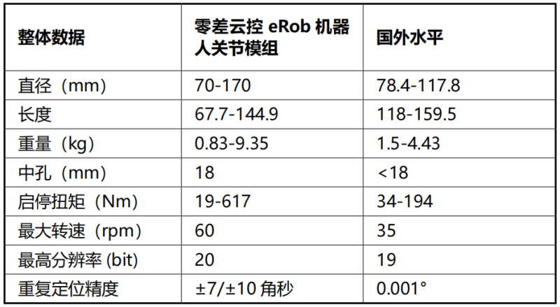 从上述技术参数的对比国外标杆数据可以看出,我们的主营产品eRob系列机器人关节模组及eCoder系列高精度编码器从各组参数都能持平甚至超越国外水平;