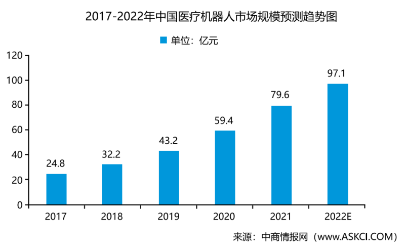 首先,我国医疗机器人的研发和应用起步于2014年,也就说发展了不到十年的时间,同时我国医疗器械的安全和检验标准是非常严格和规范的,目前很多国产医疗机器人还在临床阶段或者认证阶段,因此还没有大量的涌入市场或者作为应用,这也是您刚才说大众普及率的问题。目前国产医疗机器人在整体占比还比较低,而作为医疗机器人的主要应用之一的外科手术机器人目前仍以国外的达芬奇机器人为主,而受制于其使用及维护成本昂贵,操作能力要求高,医护人员培育等问题,也导致了手术机器人还没广泛的被认知。目前康复机器人作为相对为老百姓认识的医疗机器人,也受到了其价格、推广速度等因素影响。但是从中商产业研究院公布的医疗机器人市场规模预测来看,数据显示,2020年我国医疗服务机器人市场规模达59.4亿元,预计2022年中国医疗机器人将进一步达到97.1亿元,市场的需求量在不断的增加: