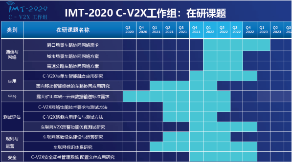IMT-2020 C-V2X工作组重点工作布局以及在研课题如下图6和图7所示[13]。