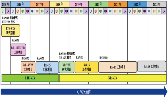 首个支持LTE-V2X的3GPP R14版本标准于2017.3完成,增强的LTE-V2X的R15版本标准于2018.6完成;