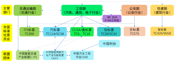 C-V2X应用涉及汽车、通信、交通、建筑等多个行业领域,依据《国家车联网产业标准体系建设指南》要求,在国家制造强国建设领导小组车联网产业发展专委会指导下,由工信部会同交通运输部、公安部、住建部、国家标准化管理委员会等部门,组织各领域相关标准化技术委员会、科研院所、产业联盟、企业等共同开展标准制定工作,建立起国标、行标、团标协同配套的新型标准体系,共同推动车联网产业发展。车联网相关标准研究组织如图3所示。