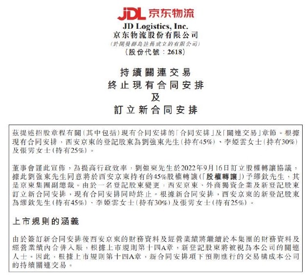 京东物流公告显示,刘强东于 2022 年 9 月 16 日订立股权转让协议,同意将于西安京东持有的 45% 股权转让予京东集团副总裁缪钦。根据新合同安排,西安京东的新登记股东为缪钦(持有 45%)、李娅云(持有 30%)及张雱(持有 25%)。