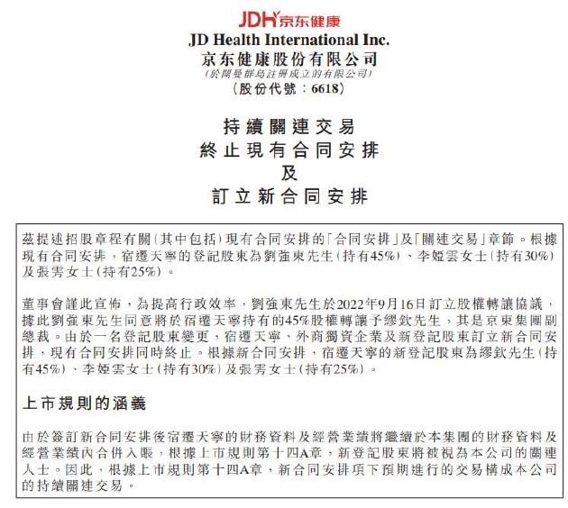 京东健康公告显示,刘强东于 2022 年 9 月 16 日订立股权转让协议,同意将于宿迁天宁持有的 45% 股权转让予京东集团副总裁缪钦。根据新合同安排,宿迁天宁的新登记股东为缪钦(持有 45%)、李娅云(持有 30%)及张雱(持有 25%)。