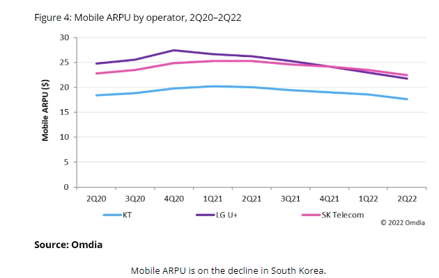 Omdia分析师Anshika Gandotra在报告中写到:“在经历了两年的持续增长后,韩国电信(KT)和LG U+的移动ARPU重新开始下降,而SK电讯(SK Telecon)则保持相对平稳,但其5G用户增长和收入增长已经陷入停滞状态。”