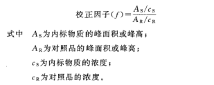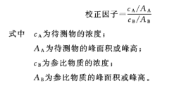 按品种正文项下的规定,精密称(量)取对照品和内标物质,分别配成溶液,各精密量取适量,混合配成校正因子测定用的对照溶液。取一定量进样,记录色谱图。测量对照品和内标物质的峰面积或峰高,按下式计算校正因子: