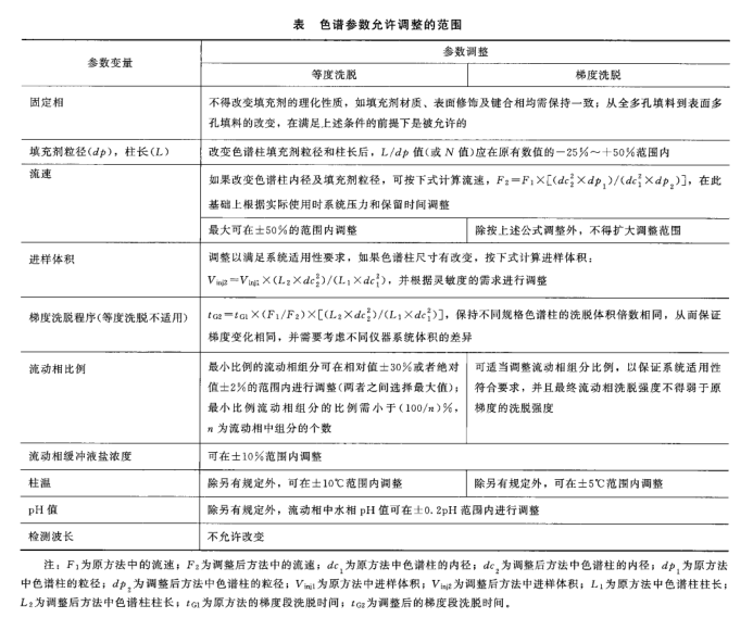 品种正文项下规定的色谱条件(参数),除填充剂种类、流动相组分、检测器类型不得改变外,其余如色谱柱内径与长度、填充剂粒径、流动相流速、流动相组分比例、柱温、进样量、检测器灵敏度等,均可适当调整。