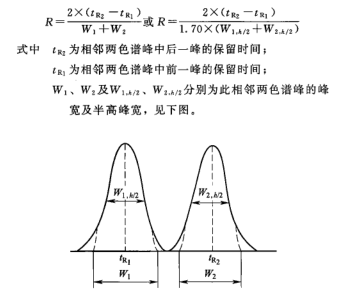 无论是定性鉴别还是定量测定,均要求待测物质色谱峰与内标物质色谱峰或特定的杂质对照色谱峰及其他色谱峰之间有较好的分离度。除另有规定外,待测物质色谱峰与相邻色谱峰之间的分离度应不小于 1.5。分离度的计算公式为: