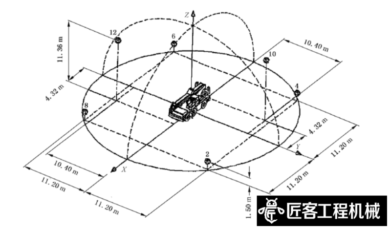 “定置作业循环工况时,机器的纵轴与x轴应保持重合,机器的前端应朝向x轴线的正方向,机器中心点应近似位于半球面中心点的垂线上方。同时在机器行驶工况时,机器行驶路径的中心线为x轴,且机器的纵轴与该轴重合。”跟随李工布置噪声测试现场时了解到,噪声测试的环境条件要求更为苛刻,降雨、降雪、冰雹天气及地面有积雪时,温度低于-10℃或高于+35℃时,风速超过8 m/s时均不能进行噪声测量。