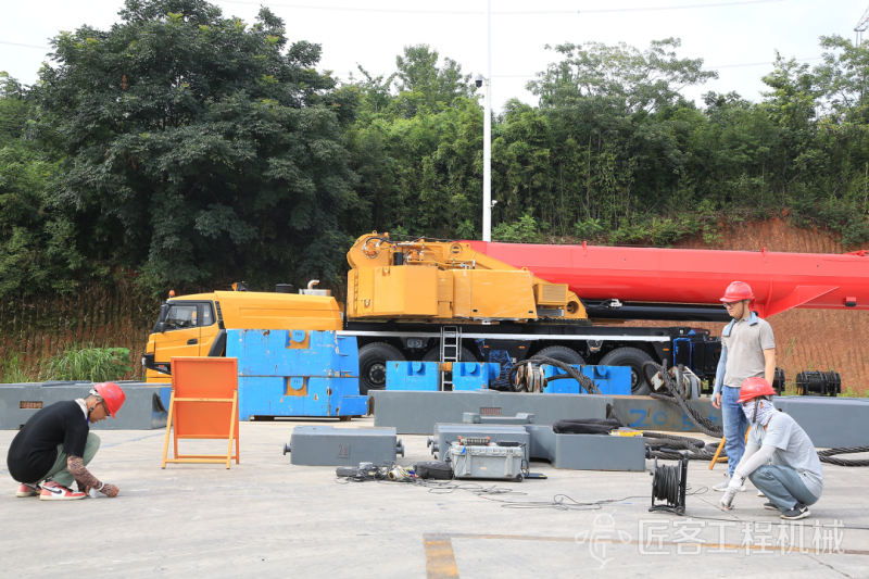 此次2022中国工程机械年度产品TOP50评测小组由来自国家工程机械质量检验检测中心的技术人员、《工程机械与维修》编辑以及快手大V“匠嘴说机”团队组成,对两款汽车起重机就支腿伸缩、待机、臂架伸缩、变幅、起升,以及起重上装的回转和噪声等一系列工况展开测试,其中STC250E5-1混动版汽车起重机需要分别进行用电模式和用油模式两个状态下评测。