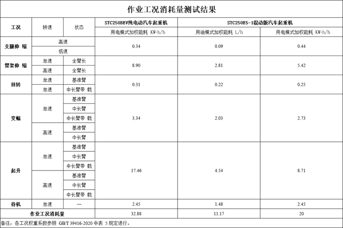 值得一提的是,在整理现场数据时数据评测小组发现就油电耗费成本来看,用电确实比用油节省了不少费用。以三一STC250E5-1混动版为例,它在插电模式下每小时作业电能消耗量为20 K·Wh,用油模式作业燃油消耗量为11.17 L/h,经过简单的油电成本计算(以油价8元/升,电费1元/度计算,平均每小时可节省约69元),它在产品实际使用过程中,电耗与油耗的比值趋近1:3,省油表现更加理想。三一也曾在这款产品的宣传中表示,可实现每年为用户降低60%的运营成本,让用户提前一年回本,当然这也是综合各种因素来看,最终的结果需等待技术人员回去进行一系列计算求证。