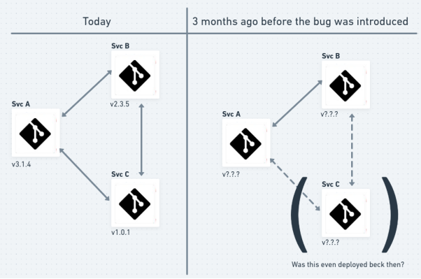 Multirepos在查找失败的根本原因时具有挑战性,有时很难找到“最后一次使用过的微服务配置”