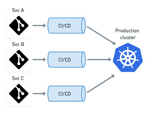 鉴于一个应用可以包含数十个微服务(和存储库),我们很容易看出,该发布方式会导致大量重复的管理开销。