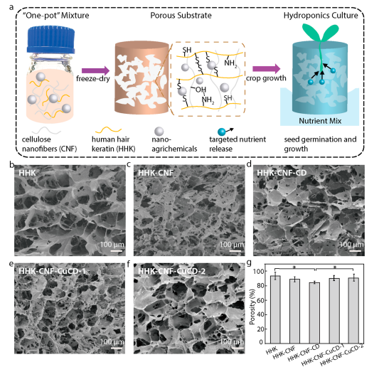 考虑到这一缺点,新加坡南洋理工大学的科学家们开始从理发店获得剪下的头发,从头发中提取角蛋白,然后将角蛋白与木浆衍生的纤维素纤维混合以加强其强度。在混合物干燥后,它形成了一种海绵状材料。这种材料随后被用作水培生长介质,用于种植芝麻菜和大白菜植物。