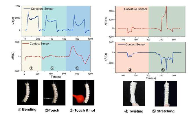 该研究用基于PAAm的可拉伸水凝胶材料,具有对应变的响应和低滞后性,并且它对温度极为灵敏(TCR = -3.8%/oC)。用其制成传感器能够实时将来自自身形变(弯曲、扭曲、拉伸)和外部环境(温度,物体接触)的刺激转换成双通道电信号,使软体机器人拥有自主感受的能力。