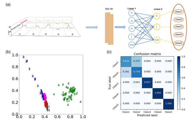 图3 (a)机器学习模型框架。(b)将分类结果用tSNE映射到低维空间 (c) 混淆矩阵表示对不同状态的分类
