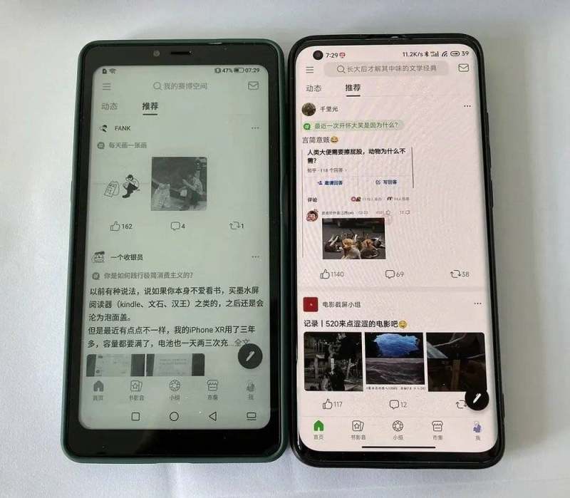 “墨水屏手机”和普通手机冲浪对比。图/@Ove 豆瓣截图
