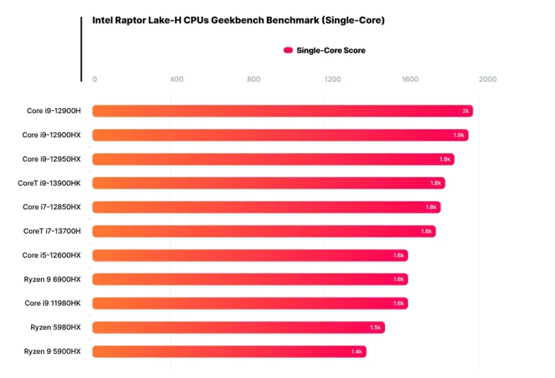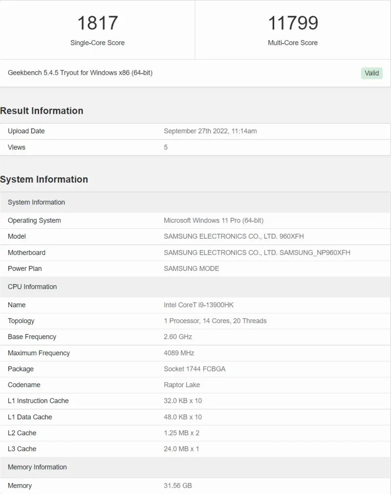 泄露的芯片包括 CoreT i9-13900HK 和 CoreT i7-13700H。现在,这是我们第一次看到用于笔记本电脑 CPU 的 CoreT 品牌。英特尔确实宣布将为其入门级芯片使用全新的命名约定,但不包括核心部分。 CoreT SKU 可能是 TDP 优化的变体,或者只是 Geekbench 数据库对“TM”的识别不佳。