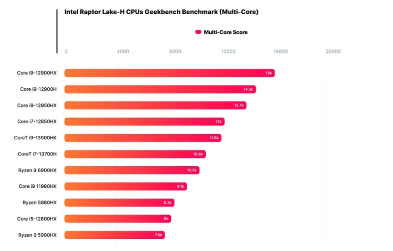 英特尔即将推出第 13 代 Raptor Lake 处理器,现在其中的高端酷睿 i9-13900HK 和酷睿 i7-13700H 两款处理器已经现身 GeekBench 跑分库。英特尔第 13 代 Raptor Lake 移动处理器阵容分为 2 个性能为导向的 CPU 分支,分别为 Raptor Lake-H55 和 Raptor Lake HX SKU。